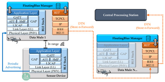 Each DM performs periodic scanning routines, while the SN transmits advertising packets with data collected by the integrated sensors. The DM nodes communicate with each other using Bundle Protocol 7, and, at the lower layers, TCP/IP (Transmission Control Protocol Convergence-Layer-TCPCL [46] and IPv6/IPv4) and IEEE 802.11 are used. Figure 2 illustrates the protocol layers adopted in the “FloatingBlue” architecture.