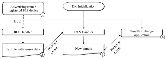 The cycle begins with receiving an advertising signal (1) from a previously registered SN by the DM. When a registered SN is detected, the BLE Handler service collects the data, formats it, and saves it into a text file (2). Subsequently, the DTN Handler service transforms this file into a bundle (3), preparing it for transmission to the destination node (4).