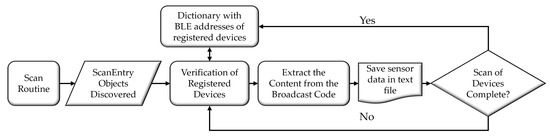 The BLE Handler software service collects parameters the SNs measure. Figure 5 illustrates the flowchart of the algorithm. The application maintains a Public Device Addresses (PDA) list of pre-registered BLE-enabled devices. The service periodically performs scanning routines to identify BLE devices within the DMs range. This scanning occurs in loops with defined intervals to maximize detection chances. When a device is detected, the data it collects is compared with the PDAs registered in the DM. If the service finds the address of a registered node, it extracts the Broadcast Code (0x2D 2D) from the advertising, along with the corresponding PDA and the timestamp of the collection. This process allows for the distinction between SNs and enables recording the exact instant of data collection. The collected data are then stored in a file, typically a text file by default.