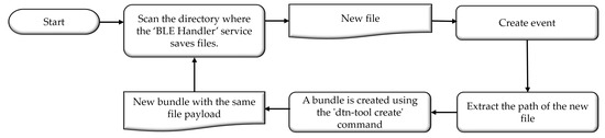 The flowchart in Figure 6 is designed to represent the steps involved in converting the output files from the BLE Handler into DTN bundles. The process starts with a continuous scan of the directory where the BLE Handler saves files. When a new file is detected, the system creates an event to trigger the bundle creation process. The flowchart then outlines how the file path is extracted and passed to the “dtn-tool create” command, which generates a new bundle with the same file payload. This design ensures that every new file is promptly and systematically converted into a DTN bundle, ready for transmission. The linear and sequential structure of the flowchart emphasizes the straightforward and automated nature of the process, highlighting how each step directly leads to the next, ensuring the efficient handling of data in the DTN network.