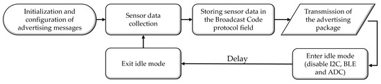 The flowchart in Figure 7 is designed to reflect the sequential and cyclical nature of the SN firmware’s operation. The process begins with initializing and configuring advertising messages, ensuring the transmitted data are appropriately formatted and broadcast. The flowchart then moves to the sensor data collection step, where environmental parameters are gathered. These data are subsequently stored in the Broadcast Code protocol field, a step that directly links data collection with transmission. The flowchart also illustrates how, after data are transmitted, the system enters idle mode to conserve energy, disabling key components such as I2C, BLE, and ADC. Including a delay before exiting idle mode and resuming data collection emphasizes the energy-efficient design of the firmware. This structured approach in the flowchart highlights the firmware’s efficiency in handling sensor data while minimizing energy consumption, which is critical for the SN’s performance in field applications.