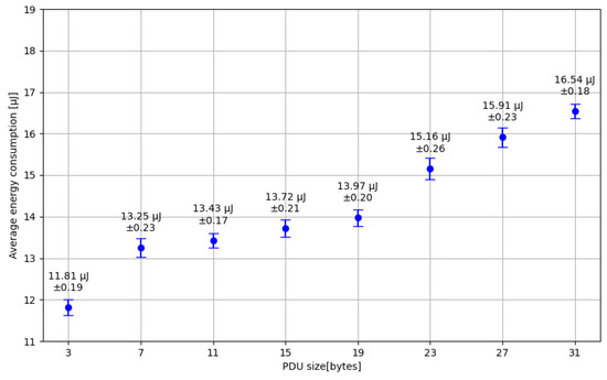 Afterward, energy consumption was analyzed by focusing on the impact of varying the BLE Packet Data Unit (PDU) payload size. It is important to note that the maximum allowed payload size is 31 bytes, divided into 3 bytes for the Flags field and 28 bytes for the actual data. The test was conducted with advertising messages being transmitted at 1-s intervals, inheriting the previous experiment’s transmission power and channel configurations. Figure 8 illustrates the obtained results.