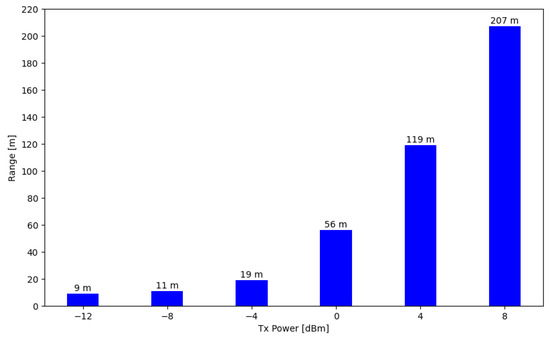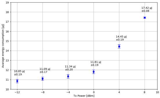Another evaluation of energy consumption conducted, as depicted in Figure 9, involved analyzing the relationship between the transmission power of the SN and its energy consumption. The Nordic nRF52840 SoC allows the BLE transceiver transmission power to be adjusted from −12 dBm to 8 dBm.