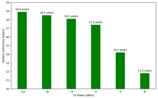 The final energy consumption assessment by “FloatingBlue” architecture is related to the projection of the SN’s battery autonomy concerning the beacon’s transmission power, as depicted in Figure 10. For this, a 1050 mAh and 3.7 V lithium battery was considered, the same specification used in the functional tests of the architecture.