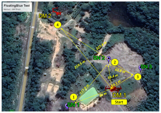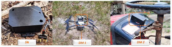 For the functionality tests of the “FloatingBlue” proposal, the SNs were deployed in a citrus plantation in a remote area in the Amazonian jungle. Figure 11 illustrates one of the three SNs placed in the ground and two DMs installed in the test environment. DM 1 was mounted on a DJI Mavic 2 Zoom drone, and DM 2 was installed on a tractor.