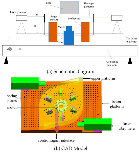 (1). A high-precision angular vibration platform with self-driving functionality was designed and implemented. The platform consists of an upper platform, a lower platform, a motor, and supporting spring plates, capable of providing precise angular vibration inputs. The design effectively addresses the need for vibration control by providing support stiffness through the spring plates while maintaining low rotational stiffness around the z-axis to ensure platform stability and accuracy.