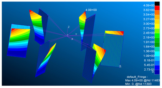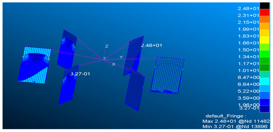 To analyze the stress conditions of the spring plates, shell elements are used for finite element modeling of the spring plates. Fixed constraints are applied to the lower ends of the spring plates to simulate the fixed boundary conditions of the lower platform during operation. The upper platform is modeled as a mass point, connected to the upper end of the spring plate through a Multi-Point Constraint (MPC), and a vertical downward force is applied at the mass point.