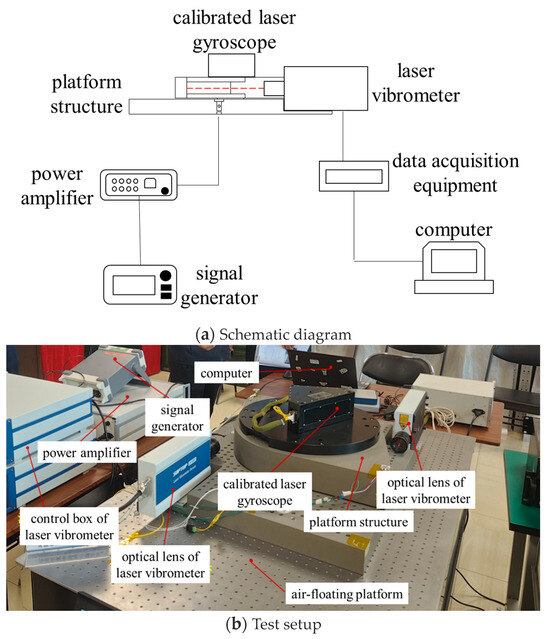 To obtain the measurement accuracy of the calibration system, a calibrated laser gyroscope was installed on the upper platform as the test load. The test results from the laser gyroscope serve as the reference values and are compared with the measured values from the calibration system. The angular resolution of the laser gyroscope (3σ, 10 kHz, 0.01–500 Hz) is 0.0000180″. The overall composition of the calibration system and the connections between its components are illustrated in the