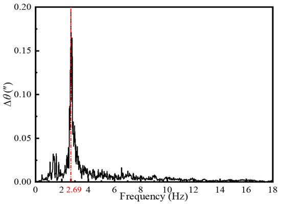 In the fundamental frequency test, the sensitivity of the laser vibrometer, the data acquisition system, and the voltage range were adjusted accordingly. Data collection was started, excitation was applied to the turntable, and after the system stabilized, the single-frequency point characteristics of the spectrum were observed and recorded. The Fast Fourier Transform (FFT) of fundamental frequency testing results, shown in the Figure 6 below, indicate that the fundamental frequency is 2.69 Hz. During the simulation, the connections between various parts were modeled using RBE2-type MPC constraints, which are idealized constraints. However, in reality, the turntable is a structure with many assembly joints, and these connections are not as ideal as in the simulation. This discrepancy led to the measured frequencies being lower than the simulation results.