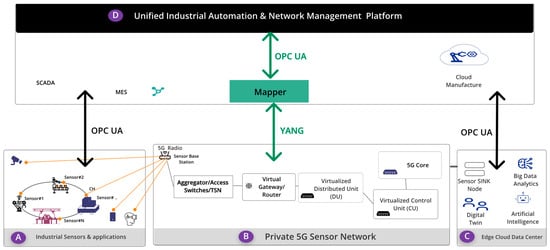 In existing industrial automation environments, the devices and applications in boundary A and C rely on the OPC UA protocol, a widely adopted standard for industrial system information exchange, to integrate with other applications, such as SCADA, MES, SAP, ERP, and cloud-based manufacturing systems [16]. Meanwhile, the components, like aggregator/access switches, time-sensitive networking (TSN) devices, virtual gateways/routers, 5G radios, CUs, and Dus, expose YANG data models for information exchange, as standardized by the Internet Engineering Task Force (IETF), the 3rd-Generation Partnership Project (3GPP), and Open RAN Working Groups 4 and 10 [17,18]. Due to the differing semantics of YANG and OPC UA, achieving interoperability between private 5G sensor networks and existing industrial-application management systems that use OPC UA is challenging. This article proposes an interoperability layer, identified in Figure 1 as the “Mapper” component, to address these challenges.