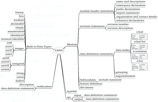 - Bjorklund, M. RFC 7950—The YANG 1.1 Data Modeling Language. 2016. Available online: https://www.rfc-editor.org/rfc/rfc7950.html (accessed on 1 July 2024).