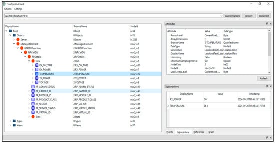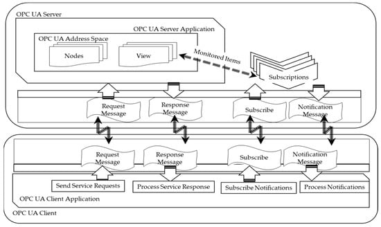 OPC UA primarily employs a client/server communication model based on standard TCP/IP, Web Sockets, and HTTP technologies. Figure 4 demonstrates the typical client/server communications in OPC UA [38]. The OPC UA framework provides a fundamental information model framework and a range of services for creating and sharing vendor-specific information in a standardized way. The OPC UA information models encapsulate the structure, behavior, and semantics of the OPC UA server. They consist of a network of OPC UA nodes that represent a variety of information types, including configurations, observability data, procedures/functions, and their interrelationships with other OPC UA nodes.