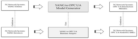 The proposed mapping involves a two-stage approach. As depicted in Figure 6, the first stage involves the offline generation of the OPC UA information models from the 5G network systems’ YANG schema. The model generator takes the YANG schema as input and generates the mapped OPC UA information model files based on the mapping metadata. In the second stage, at runtime, the adapter converts the YANG model instances into corresponding OPC UA information model instances for the connected device. The primary motivation of this article is to propose a solution to address the first stage with the support of generating the OPC UA information models from YANG models. The second stage shall be addressed in future work.