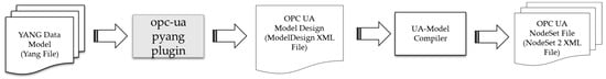 A YANG to OPC UA model design generator is developed as a plugin on top of existing open-source software called pyang [22]. The logic of the OPC UA pyang plugin for the generation of the OPC UA model design file is based on the YANG to OPC UA mapping explained in previous sections. The generated XML output conforms to the schema defined in the UA Model Design.XSD and then passed to the existing OPC foundation model compiler to generate the OPC UA NodeSet2 XML files and different-language SDK files, as depicted in Figure 7. The authors published the opc-ua pyang plugin and its software implementation, the sample YANG and OPC UA files, and the documentation on how to use the plugin to generate OPC UA NodeSet2 files in their GitHub repository [23].