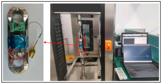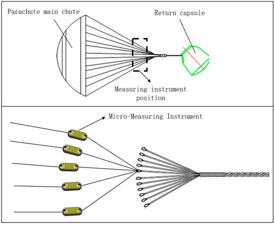 The instrument is installed on the parachute cords in the form of “tandem”, and through the signal acquisition system, the strain signal of the Load Cell is converted into an electrical signal, and the collected data are sent wirelessly to the upper computer test software, which processes and saves the data. The schematic diagram of the miniature measuring instrument installed in the parachute is shown in Figure 1.