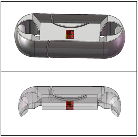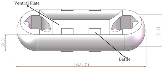 The Load Cell I is designed to be an integrated structure and the two end earrings are connected with the parachute cords. The middle concave web plate is used for installing a strain gauge and encapsulating electronic components of an acquisition system, and the eight protruding “baffles” are used to protect electronic components [14]. SolidWorks 2022 software is used for 3D modeling, and the design size of Load Cell Scheme I is 163. 71 mm × 53.71 mm × 30 mm, as shown in Figure 4.