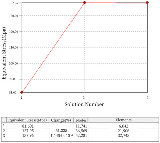It can be seen that the mesh division in the entire static analysis underwent two refinements, reaching a convergent state. In Figure 5, the “change (%)” column represents the current convergence error. After two mesh refinements, the error becomes negligible, meeting the requirement of less than 5% error specified during the setup. Therefore, the iteration of the adaptive mesh division concludes. The final number of mesh nodes is 52,281, and the number of elements is 32,743, as shown in Figure 6.