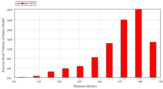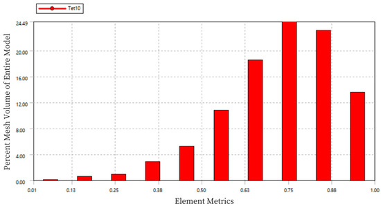 In the chart, the horizontal axis “Element Metrics” represents the comprehensive quality measurement standard, and the vertical axis “Percent Mesh Volume of Entire Model” represents the percentage of the total model volume for each mesh quality. The quality of the mesh elements is measured on a scale from 0 to 1, where a value of 0 indicates a cell with zero or negative volume, which should be avoided in the mesh division. A value of 1 represents a perfect cube or square, which is the ideal mesh. As seen in the figure, the mesh quality is concentrated between 0.75 and 0.9, indicating good mesh division quality.