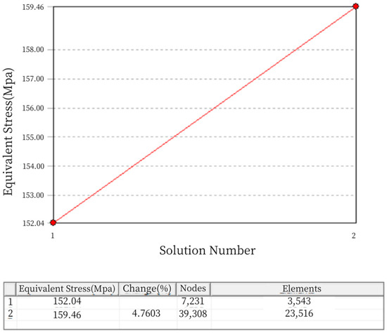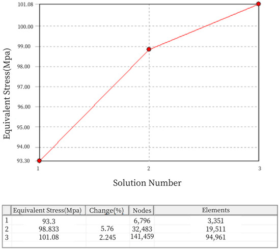 It can be seen that the mesh division underwent two refinements during the static analysis, reaching a convergent state. In Figure 12, the “change (%)” column represents the current convergence error. After two mesh refinements, the error is 2.245%, which meets the specified requirement of less than 5% error. Therefore, the iteration of the adaptive mesh division concludes. The final number of mesh nodes is 141,459, and the number of elements is 94,961, as shown in Figure 13.
