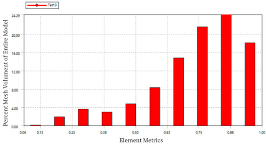 The quality of the mesh elements is measured on a scale from 0 to 1, where a value of 0 represents elements with zero or negative volume, which should be avoided in the mesh division. A value of 1 represents a perfect cube or square, which is the ideal mesh. As shown in Figure 14, the mesh quality is concentrated between 0.75 and 0.9, indicating good mesh division quality.