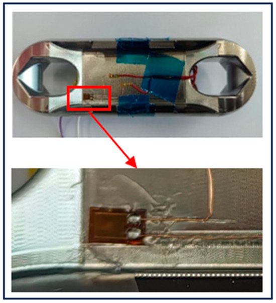 As shown in Figure 9, after bearing a force of 8000 N, the maximum strain in Load Cell Scheme I is 2.84 × 10−4 mm/mm. The maximum strain occurs at the four corners of the Load Cell’s web position. Thus, the location with the maximum strain in the Load Cell can be selected as the position for attaching the strain gauges.
