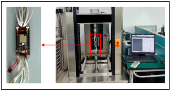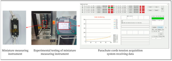 Install the miniature measuring instrument to the universal testing machine, and start the parachute cords tension acquisition system software and the universal testing machine at the same time to begin the experimental testing, as shown in Figure 49.