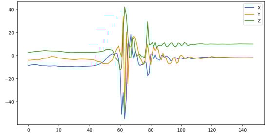 One of the main sensors used in fall detection on a smartwatch is an accelerometer, which measures the acceleration of an object. Acceleration is the change in velocity over time, and velocity represents the rate at which an object changes its position. Acceleration data are commonly used in fall detection because a distinct change in acceleration happens when a fall occurs. The clustered spikes in Figure 1 show a unique pattern in the acceleration data during the time when the fall occurs, which means that falls can be identified in acceleration data by that pattern.
