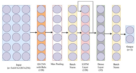 The CNN-LSTM we used integrates two fundamental Neural Network components: Convolutional Neural Networks (CNNs) and Long Short-Term Memory (LSTM) networks. It starts with a 1D convolutional layer with a ReLU activation function, followed by max-pooling to capture local patterns in the input sequence. This combination is repeated for increased feature extraction. A subsequent LSTM layer is introduced to capture long-term dependencies in the data. Dense layers with a ReLU activation follow. Batch normalization is applied throughout the model to enhance training stability. The final output layer employs a sigmoid activation function for binary classification. The model is compiled using BCE and an Adam optimizer. Figure 3 shows the CNN-LSTM that we have used in our study.