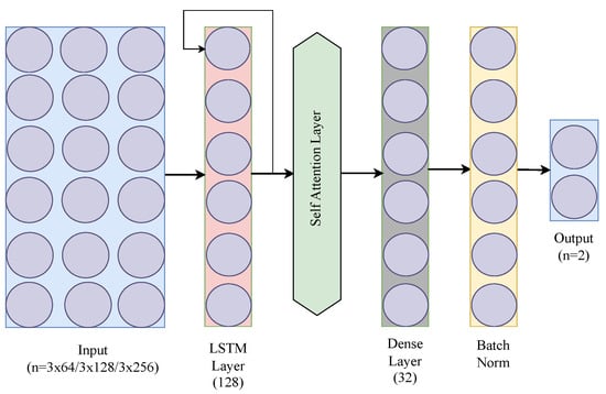 We implemented another variant of the LSTM model, called LSTM w/self-attention, where a self-attention layer is incorporated into the basic LSTM implementation to enhance its ability to process time series data. Self-attention is a mechanism that allows the model to weigh the importance of different parts of the input data. It helps the model to focus on the important time points of the input sequence for making predictions. Here, the output of the LSTM layer is passed to a self-attention layer. This means that the sequential output of the LSTM is further processed by the attention mechanism. This addition enriches the model’s capacity to identify crucial patterns in data while maintaining its lightweight nature for wearable devices. The model, still trained using backpropagation through time (BPTT), benefits from this advanced feature, offering a more nuanced understanding of temporal dynamics without compromising efficiency. Figure 4 presents the architecture of LSTM with self-attention that we have used. In these three Figure 2, Figure 3, Figure 4 we have used different colors to distinguish the layers of each architecture. For instance, the LSTM layers are represented by the same color across all three figures, while the dense layer is assigned a unique color to differentiate it. This approach has been applied consistently to all the other layers as well.