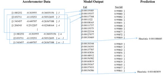 Fall prediction using all three variants of LSTM-based architecture is made on a sliding window of data that is W data points in length. Each prediction outputs a probability of fall between 0 and 1. Figure 5 depicts the prediction schematic. The model prediction begins once the number of sensor data points acquired is equal to the number of the configured window size W. Every model prediction thereafter will only require additional data points, which is the step size S. That means the consecutive windows have a time step overlap. However, before producing a final prediction, we generate a heuristic value based on the probabilities produced by the average of 20 consecutive model predictions. This value is derived from experimentation, with values ranging from 1 to 20 with five increments. In essence, we compute the average value of 20 consecutive probabilities and compare this with a pre-defined threshold value. During the training and validation of the model, a threshold of 0.5 yields the optimal results, and is used in the SmartFall App. If the average probability exceeds this threshold, then it is considered a fall prediction. This helps to prevent isolated positive model predictions from triggering a False Positive.