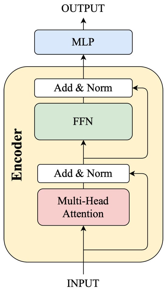 We implemented the Transformer architecture described in [10], which has an encoder–decoder structure. We chose the encoder part for fall detection, since it has been shown in [28] that the Transformer can achieve high accuracy for human activity recognition. This architecture, as shown in Figure 6, has four encoder layers, and four attention-heads in each layer to balance the model size and performance metrics when deployed on power- and computation-constrained wearable devices. The original Transformer also has a decoder part that generates a new sequence in machine translation. We do not need any decoder layers for fall detection, as we do not need to re-construct any new sequences. The attention mechanism is essential in the Transformer model, with multiple attention heads seeking different relevance definitions or correlations [28]. Multi-Head Attention (MHA) involves mapping queries and key–value pairs to an output. In a single attention head, scaled dot products of queries(Q) and keys (K) are calculated, followed by softmax normalization, which yields weights that are multiplied by values (V), as shown in Equation (1). The output from multiple attention heads is then concatenated and projected to obtain the final output, as shown in Equation (2). The Multi-Head Attention is followed by Layer Normalization and a skip connection with input before the Multi-Attention.