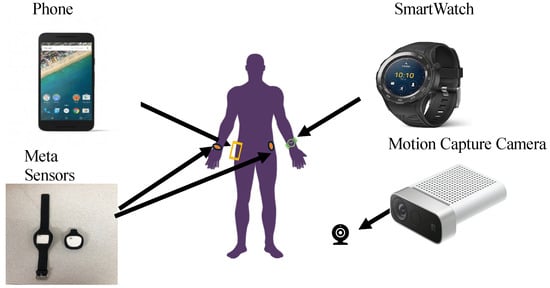 SmartFallMM is a multimodal dataset focused on falls and ADLs data, gathered from 16 student participants (11 male and 5 female) with a median age of 23, and 26 older participants (12 male, 14 female) with a median age of 65.5. Our multimodal data collection was approved by IRB 9461 at Texas State University, and was the first multi-modal dataset that has both older and younger adults’ data. We only asked student participants to perform falls on an air mattress. All participants needed to sign consent forms before their data could be collected. Two modalities were collected using four types of devices. We collected skeleton data using Azure Kinect cameras, time-series data such as accelerometer data, and gyroscope data using three inertial sensors (i.e., meta sensor, Huawei Smartwatch, and Nexus phone). Meta sensor was developed by MBIENTLAB in San Jose, CA 95124, USA (mbientlab.com); accessed on September 23, 2024. The participant wears the Huawei watch on the left wrist and puts the Nexus smartphone on the right hip inside a harness. A wrist meta sensor was placed on the right wrist of the participant, and the hip meta sensor was placed on the left hip of the participant (clipped onto the belt). This setup allowed us to collect data from four important joints of the human body when a person moves. Figure 8 shows the positions and the types of sensors used for the data collection.