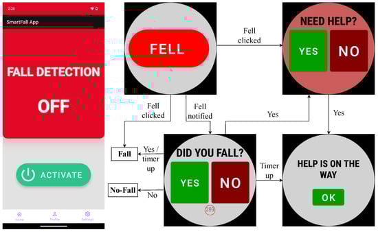 Figure 9 shows the phone and watch’s UI in the SmartFall application. We followed the best practices advocated in the literature for the design of the UI for older adults. The three main principles we adopted were a strict color scheme with high contrast, legible and big fonts, simple descriptions of the system to engage them to use it. The background of the “NEED HELP?” screen is changed to red color to distinguish it from the “DID YOU FALL?” screen. The users must react correctly to these two screens. After pairing the phone and the watch, as soon as the user presses “activate” on the phone’s UI, the sensor on the watch will sense the accelerometer data from the watch continuously. Model predictions (i.e., predictions produced by the neural architecture) begin once the number of sensor data points acquired is equal to the defined window size.