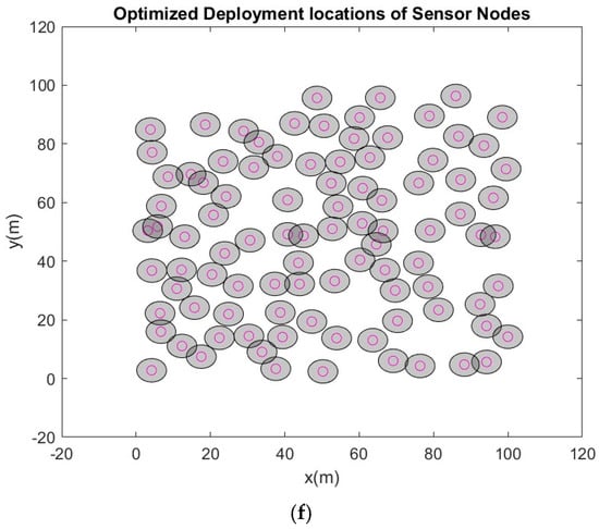 Initial locations of sensor nodes and their optimization using the proposed EPSO algorithm. (a) With 40 sensor nodes: initial locations of random deployment at 3.6 GHz. (b) With 40 sensor nodes: Optimized locations after applying the EPSO algorithm at 3.6 GHz. (c) With 65 sensor nodes: Initial locations of random deployment at 3.6 GHz. (d) With 65 sensor nodes: Optimized locations after applying the EPSO algorithm at 3.6 GHz. (e) With 95 sensor nodes: Initial locations of random deployment at 3.6 GHz. (f) With 95 sensor nodes: Optimized locations after applying the EPSO algorithm at 3.6 GHz.