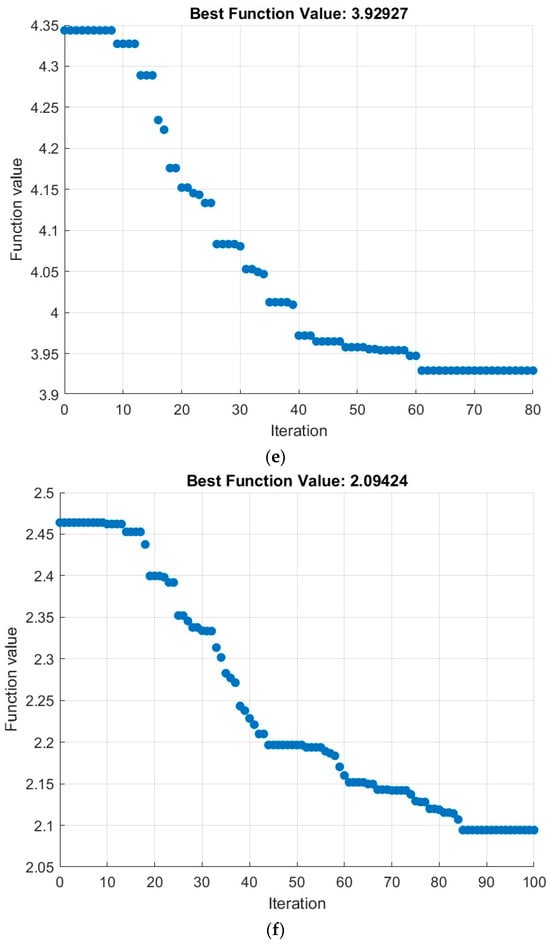Fitness function values of the EPSO algorithm. (a) 50 sensor nodes at 3.6 GHz. (b) 100 sensor nodes at 3.6 GHz. (c) 50 sensor nodes at 26 GHz. (d) 100 sensor nodes at 26 GHz. (e) 50 sensor nodes at 38 GHz. (f) 100 sensor nodes at 38 GHz.