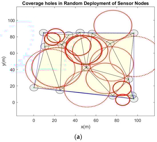 The performance of the proposed EPSO algorithm was verified through simulations and visualization of the results in a MATLAB 2024a environment. Simulations were conducted using an Office 365 operating system for an increased network size from ten to one hundred SNs in steps of five, and the other simulation parameters are listed in Table 2. SNs are assumed to be mobile and homogeneous in terms of their features. After their random deployment in the given network terrain, they were configured with a uniform radio range; their initial positions and nodes were assumed to be at their initial best local positions. The communication range of the SNs was set to twice their sensing radius. Figure 3 shows the results of random deployment versus optimal deployment for a few scenarios. Similarly, the simulations were conducted for different frequency bands in the FR1 and FR2 ranges (n48, n258, and n260 bands) [43]. The results of optimal deployment clearly showed that the presence of SNs closer to each other is avoided to the maximum extent. Then, coverage holes are detected by applying the DT method for the initial deployment of the SNs, as shown in Figure 4. Parameters such as the inertia weight and acceleration factors of the velocity vector and the battery depletion levels were optimally selected based on rigorous simulations and analysis of the results. The objective function was computed for each SN and the global best value was defined. The best value of the fitness function was used to derive the optimal locations of the SNs and to cover the detected holes.