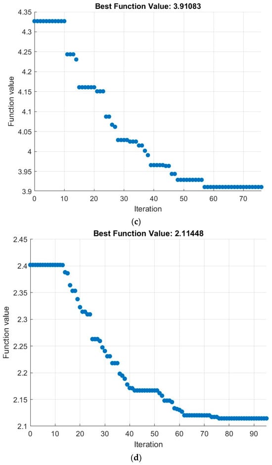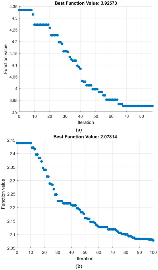 Fitness function values of the EPSO algorithm. (a) 50 sensor nodes at 3.6 GHz. (b) 100 sensor nodes at 3.6 GHz. (c) 50 sensor nodes at 26 GHz. (d) 100 sensor nodes at 26 GHz. (e) 50 sensor nodes at 38 GHz. (f) 100 sensor nodes at 38 GHz.