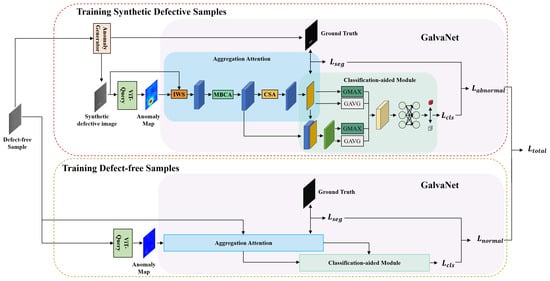 In this section, we introduce a novel network architecture, GalvaNet, which consists of two stages, aggregation attention and the classification-aided module, as shown in Figure 1. This model utilizes synthetic defective images and anomaly maps derived from ViT-Query as network inputs. The purpose of GalvaNet is to leverage the valuable global information from the ViT-Query and enhance the accuracy of defect segmentation and localization. Essentially, this approach aims to augment the model’s capacity to acquire local information while performing segmentation tasks [].