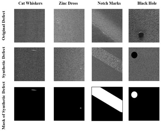 Using the above strategy, we obtain synthetic anomaly images from the perspectives of texture and structure. Due to the randomness of defect types and positions on steel with complex textures, our synthetic defects will appear anywhere in the image, maximizing the similarity between synthetic anomaly samples and real anomaly samples. Compared to RGB images, which have colors, grayscale images only have 255 grayscale values. Owing to this characteristic of grayscale images, when we use out-of-distribution grayscale values to fill the image and create defects, the resulting images are more likely to resemble real defect images, as shown in Figure 5.