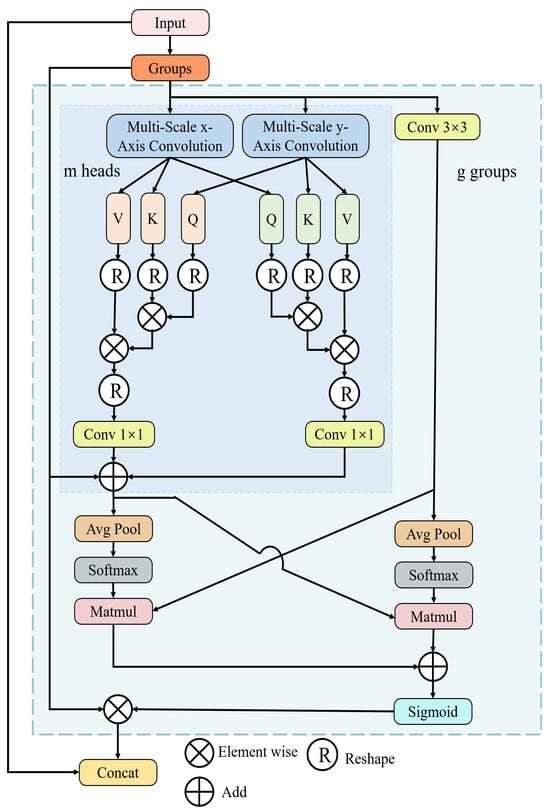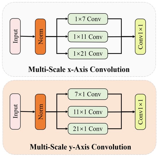 Multi-scale biaxial cross-attention (MBCA): Inspired by EMA and MCA, we design a novel method named multi-scale biaxial cross-attention that integrates multi-scale features and axial features, aiming to better segment defect regions of various sizes and shapes. As illustrated in Figure 6, MBCA utilizes convolutional kernels of different sizes and shapes to capture local information from various defect regions as comprehensively as possible, thereby enhancing the model’s ability to represent defect features. The MBCA module divides the input feature map into g groups, and each set should pass through three branches. The specific feature extraction method of the multi-scale x-axis convolution and multi-scale y-axis convolution is illustrated in Figure 7. When performing feature extraction with axial cross-attention, each input feature map needs to undergo LayerNorm, followed by three strip convolutions of different shapes and then a convolution operation. The formulation can be written as follows: