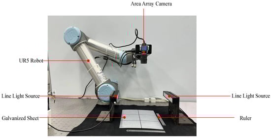 The surface defect collecting system for galvanized plates captures images of the galvanized plates using an area array camera operated by a UR5 robot under the illumination of an online light source.