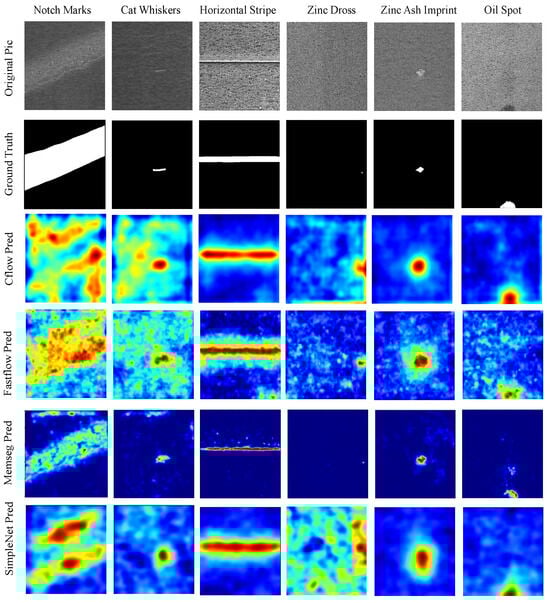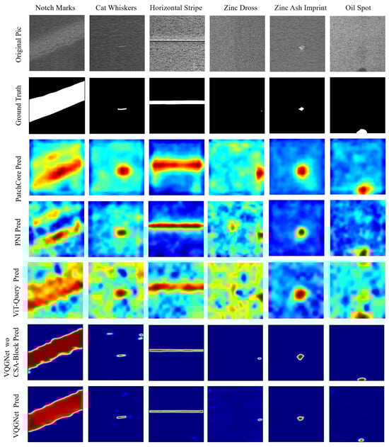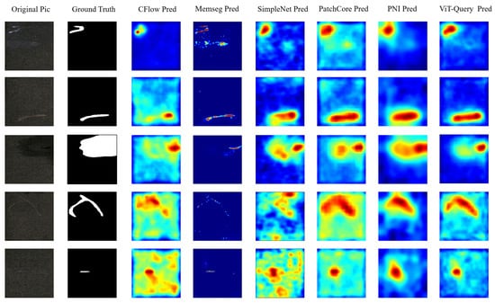 Nonetheless, the improvements in P-AUROC and P-F1 are still remarkable. We believe this is because the synthetic defect images used in network training effectively handled various complex defects occurring in real texture images, learning more precise localization information. As shown in Figure 11, Figure 12 and Figure 13, compared to the visual results of the other algorithms’ anomaly maps, the visual results of VQGNet are significantly better. The visual results of VQGNet are mostly within the key areas indicated by ViT-Query’s visualization, specifically the red regions. This suggests that ViT-Query’s anomaly map provides sufficient prior knowledge of GalvaNet. ViT-Query tends to focus more on global information in the task of anomaly detection on galvanized surfaces, while its attention to local information is relatively weaker. This explains why, despite ViT-Query’s high classification metrics, its segmentation metrics are less satisfactory. However, it is reassuring that ViT-Query provides a rough range for the segmentation results, within which we can perform a more detailed search. ViT-Query exhibits good performance in certain areas with significant defects, such as notch marks, and it better indicates the locations of defects compared to the other algorithms. Leveraging the enhanced defect recognition capability gained from normal images and synthetic defect images, GalvaNet produces a superior Anomaly Map, even though VQGNet may lose some information.