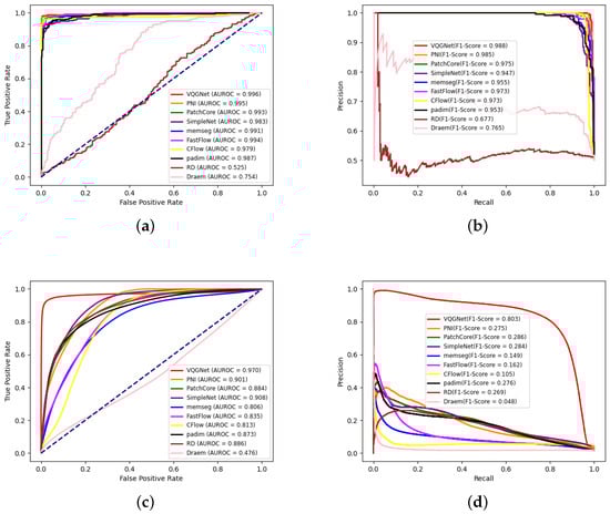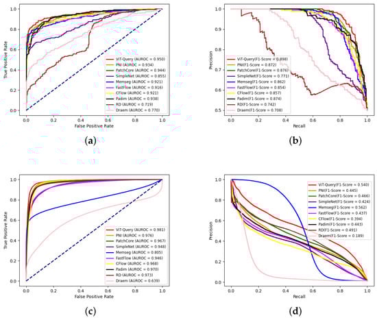ROC and precision–recall curve at the image and pixel levels of all algorithms on KSDD2. (a) Image-level ROC curves; (b) image-level precision–recall curves; (c) pixel-level ROC curves; (d) pixel-level precision–recall curves.