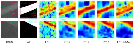 Effects of the neighbor feature aggregation parameter r: As shown in the Table 6, choosing different sizes of kernels for neighborhood feature aggregation significantly affects the performance of ViT-Query. The experimental results indicate that with , ViT-Query achieves better comprehensive results in I-AUROC, I-F1, P-AUROC, and P-F1 compared to other settings. During the experimental process, we observed that using small kernels for neighbor feature aggregation is more sensitive to small-scale features and the boundaries within the image (i.e., the boundary between defect areas and normal areas). However, due to the texture of the steel surface, this approach is prone to misjudgment. On the other hand, larger kernels tend to capture defect features over a larger area, but this leads to poorer segmentation performance at the boundary between defect areas and normal areas, as shown in Figure 16.