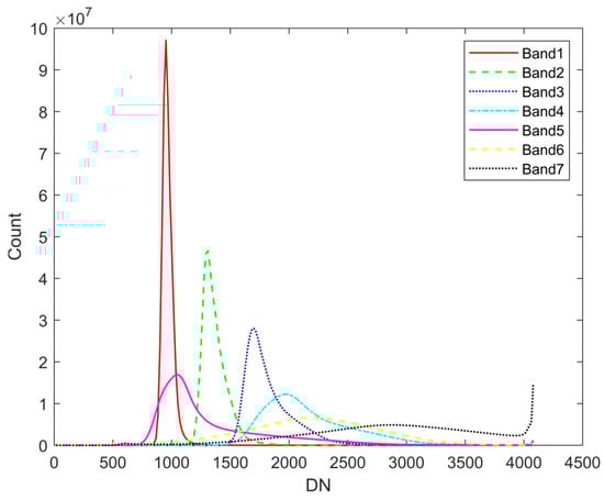 We analyze the histogram distribution curves of grayscale values for the seven bands of the MII one-scene image, which includes features such as mountains, vegetation, and water. As depicted in Figure 2, the overall grayscale values of B1 band are lower than other bands. This is because most features, such as vegetation, water, buildings, soils, and mountains, have low reflectance for the electromagnetic wave of the B1 band, making it more susceptible to noise, as shown in Figure 1b