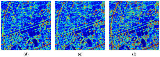 Heatmaps of Figure 1d–f and their gradient images: (a) Band3 image; (b) Band4 image; (c) Band5 image; (d) Band3 gradient image; (e) Band4 gradient image; (f) Band5 gradient image.