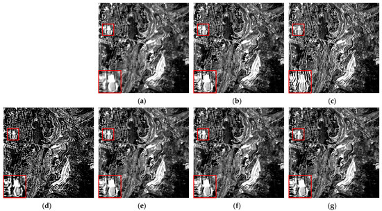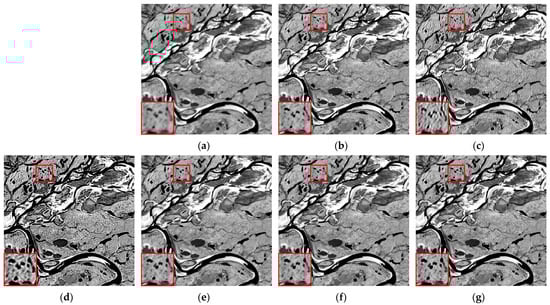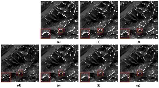First, we analyze the results from a subjective perspective. The PMP, CPMMP, and our proposed method deliver satisfying visual effects across all images. However, the NSM, LMG, and max–min methods perform poorly in many images, introducing artifacts that degrade visual quality. Specifically, the max–min method excessively sharpens the images, making the details appear overly messy. For the LMG method, in Figure 8b, additional image structures appear at the edges of square buildings, and in Figure 9b, which depicts mountains and snow distribution, the results show unnatural transitions at the edges of the snow. The results of NSM in Figure 7c, Figure 8c, Figure 9c, Figure 10c and Figure 12c are severely contaminated by artifacts, causing significant alterations to the image structures.