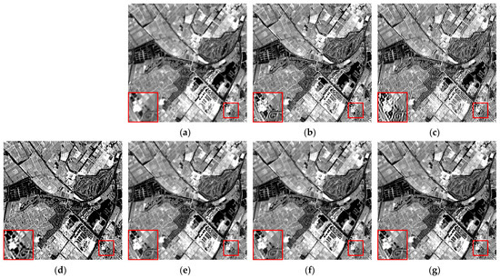 In the previous section, we observe that the method proposed in this paper does not introduce artifacts. Table 3, Table 4 and Table 5 also show the average performance in metrics. We can see that artifacts affect the metric results. To analyze the improvement effect of the proposed method on each band from B1–B7, we select another four images that visually show no artifacts. However, the images produced by the max–min method exhibit significant distortion, leading to higher metric values. We have decided not to include these results here, as they do not align with the subjective evaluation. Figure 13 shows the metric changes for each band of these four images. For the B1 band, the results of each method are denoised using joint bilateral filtering, and the B2 band with the highest similarity is used as the reference image.