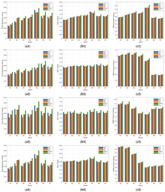Metrics of CASEarth MII image B1–B7 bands: (a1) point sharpness values; (b1) edge strength level values; (c1) RMS contrast values; (a2) point sharpness values; (b2) edge strength level values; (c2) RMS contrast values; (a3) point sharpness values; (b3) edge strength level values; (c3) RMS contrast values; (a4) point sharpness values; (b4) edge strength level values; (c4) RMS contrast values.