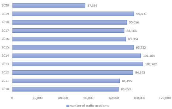 In Peru, the statistics of the National Police of Peru (PNP) show that 983,193 accidents were registered during the last decade (2010–2020), as shown in Figure 1. The year with the highest number of road accidents was 2013 (102,762), followed by 2014 (101,104) and 2019 (95,800) [2]. In the first semester of the year 2022, 38.53% of traffic accident injuries occurred in Lima, while 61.47% occurred in the rest of Peru [3].